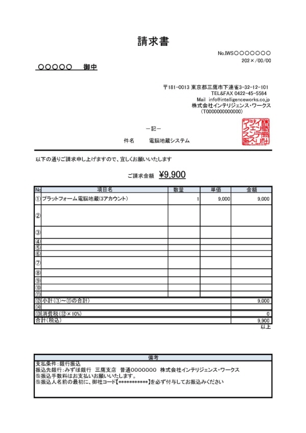 ご注文を受け付けると、メールにて下のご請求書をお送り致しますので、お振込みをお願い致します。